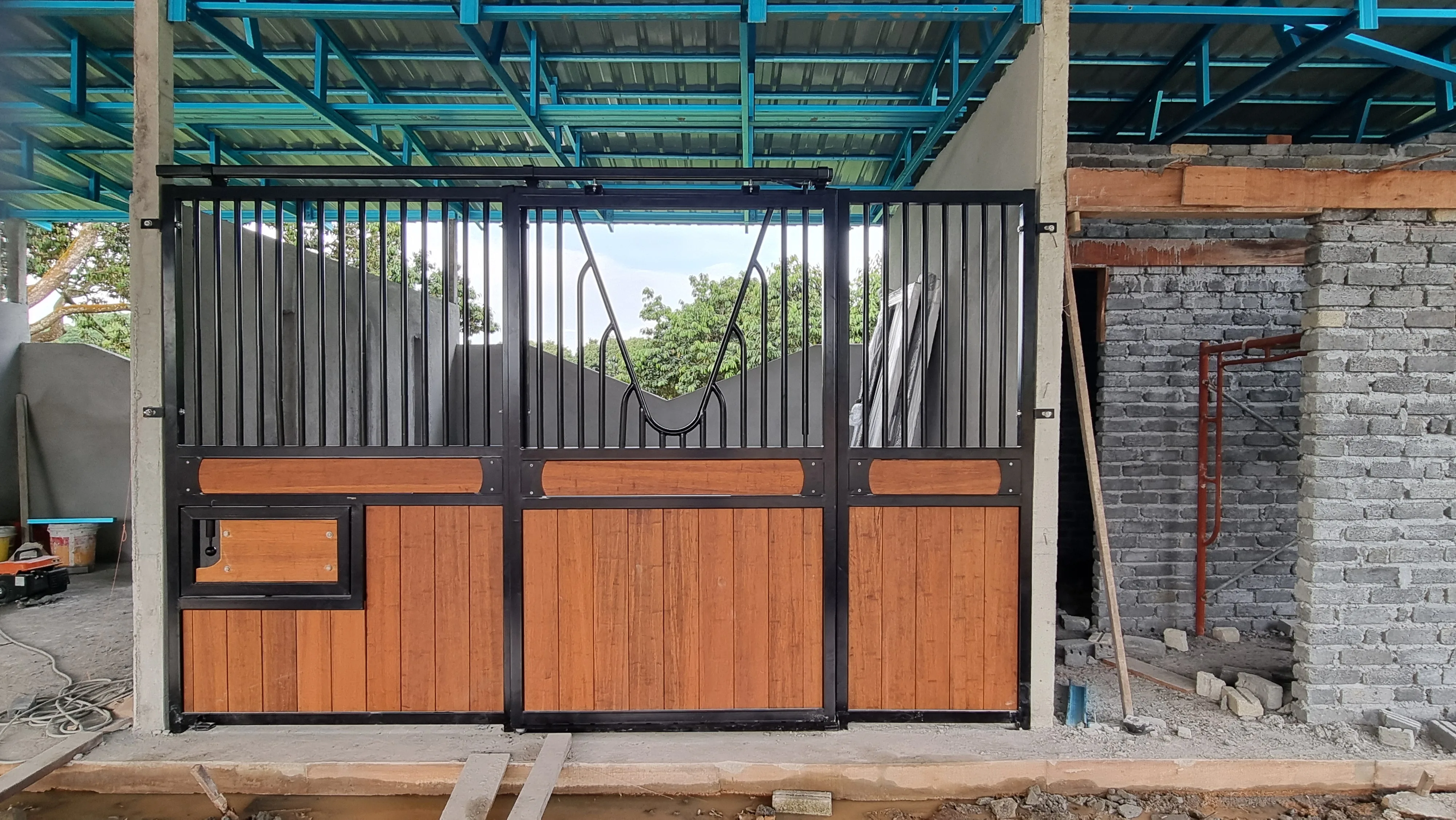 # ציפוי אבקה מגולוון מצופה מפואר דלת הזזה סוס # יציב # עיצוב עם חלון מסוג V עם מזין מסתובב מעלות 360 מעלות
